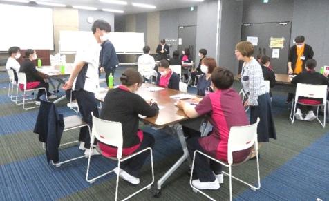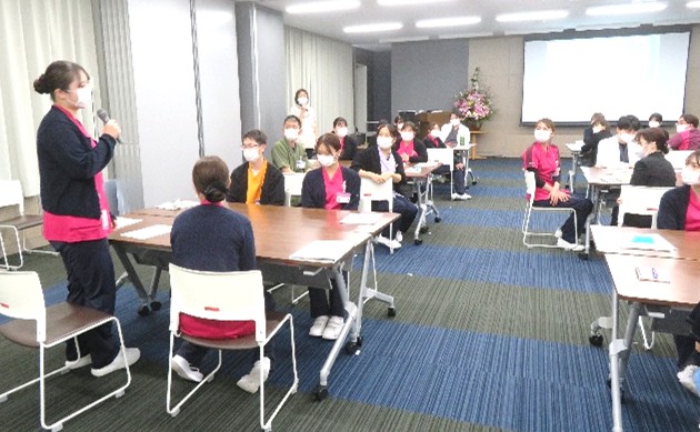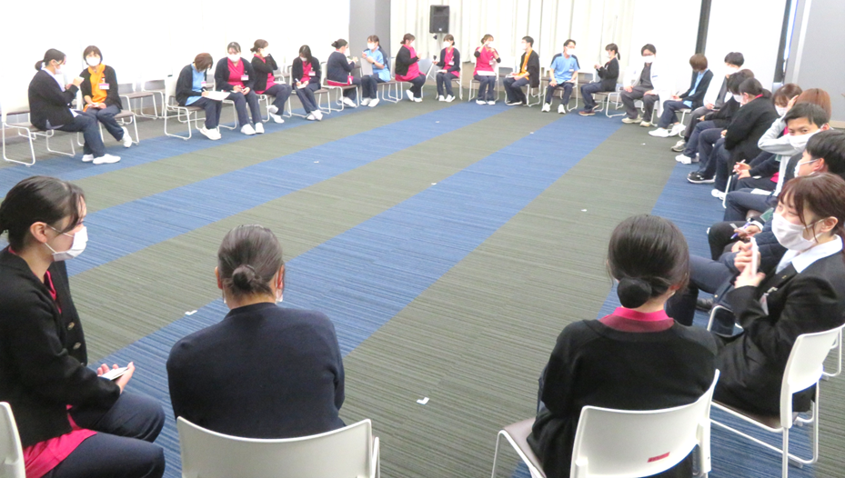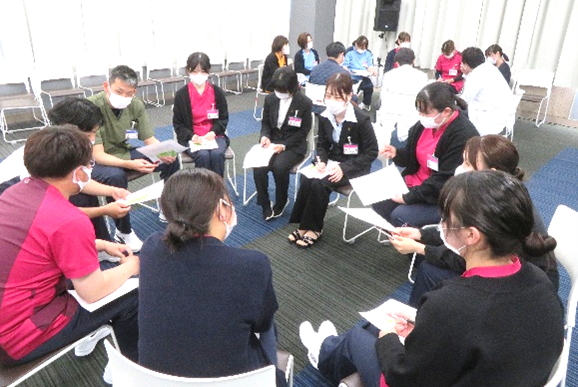 各部署に1名ずつ教育担当者が配置されていますので、9名が集まりグループワークを行いました。自部署での成功体験や悩みをみんなで共有しあい、互いに情報共有したり、助言をもらったりしながら進めていきました。次年度につながる話し合いができました。