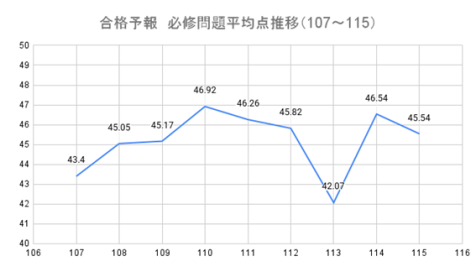 最後に、必修問題の平均点の推移を示します。第115回の必修問題平均点は45.5点であり、過去の試験の動向に照らすと概ね平均的といえるようです。