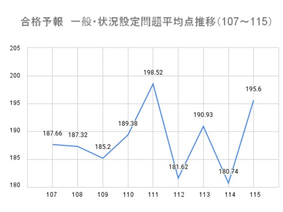 次に、一般・状況設定問題の平均点の推移です。第115回の一般・状況設定問題平均点は195.6点。